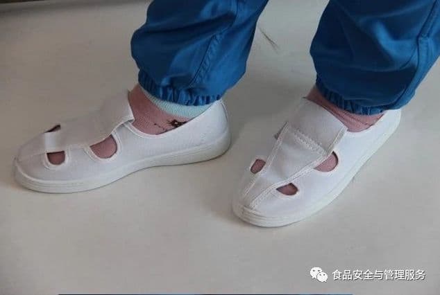 主产车间若是干区,可以穿透气性好的胶鞋;如糖果、巧克力或脱水蔬菜包装的话,就可以穿类似运动鞋的简易鞋子了。