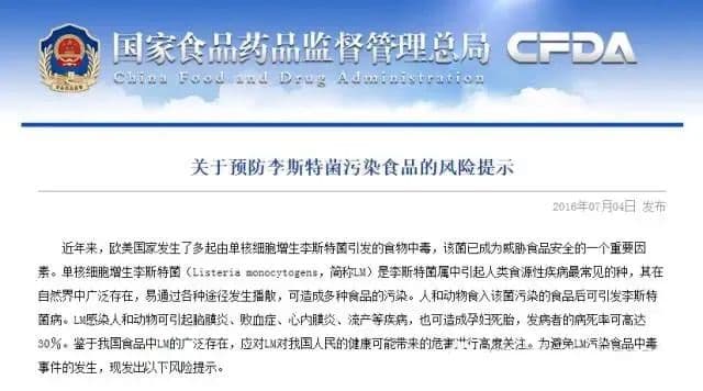 国家食药监局发布的《关于预防李斯特菌污染食品的风险提示》