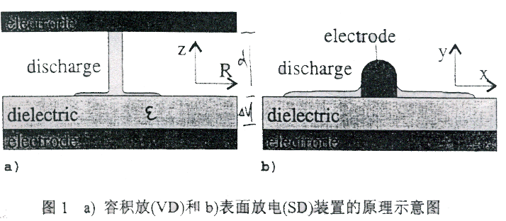为了以便利的方法(例如在常压下)产生无热能放电,通常使用介电体屏障放电(或称稳定的无声放电)。其基本的结构如图 1 所示。施加升高的电压在容积放电( VD )或表面放电( SD )装置上,当达到击穿场强的瞬间,出现晕辉。在常压下大量微放电即相当均匀地覆盖电极区域。