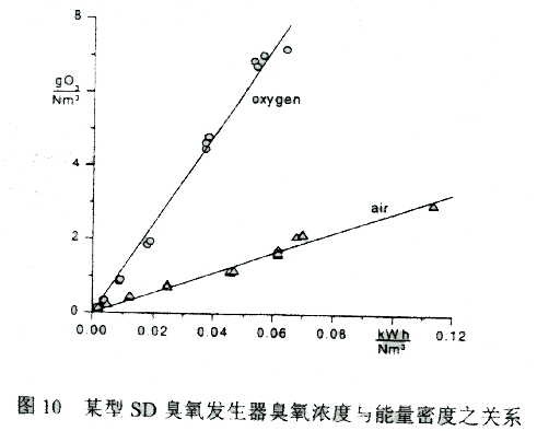 由经验可知VD发生器使用氧气源的臭氧产量比使用空气源高出两到三倍。对SD发生器来说这个差别要显著得多(图10)。这就是为什么SD发生器通常使用氧气源的缘故。频率升高则臭氧产量增大,但以良好冷却防止温度急剧升高为条件。在以空气为气源来运行的情况下频率高于10kHz,则高价与低价氮氧化物之间的平衡状态可能会朝着低价氮氧化物的方向移动,这样可能会“毒害”臭氧发生。