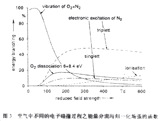 在放电的内部电子象离子一样在电场中被加速。主要是电子的碰撞产生氧原子。然而,从电子碰撞获得的不仅仅是导向分解过程。存在着大量的竞争的单体碰撞过程,从而减小有效的分解并且使放电柱中的温度升高(图3)。