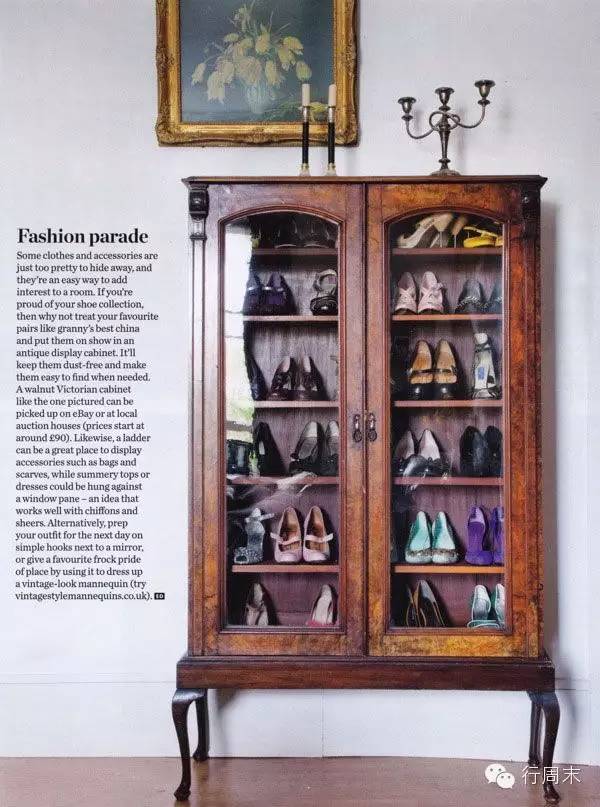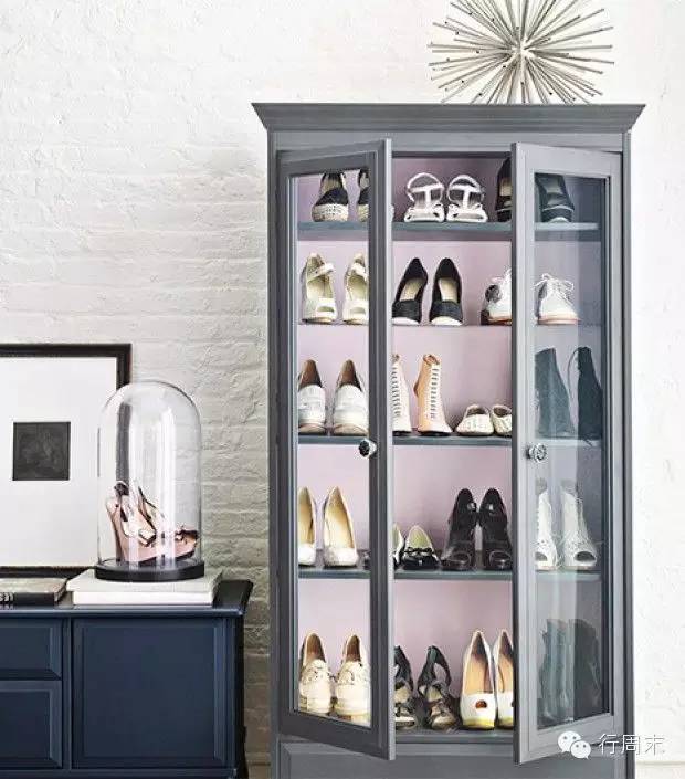 如果你喜欢百货公司那种橱窗一样的华丽感觉,不妨可以动点小巧思将原本客厅里的玻璃柜来放置鞋履,放上当季新款的鞋子,偶尔换季的时候也能整理一下鞋柜,也是一种乐趣啊。