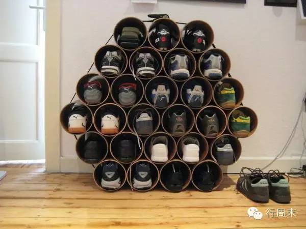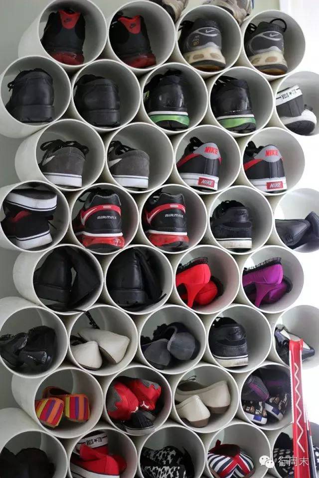 除了用木箱,还可以试试PVC管的改造。用简单的PVC能做出有型又酷的鞋架,突破一般常规的四四方方的鞋柜,让居家环境更活泼有趣。不过,要先确定PVC的高度可以放下你的“恨天高”,不然可就纠结了。