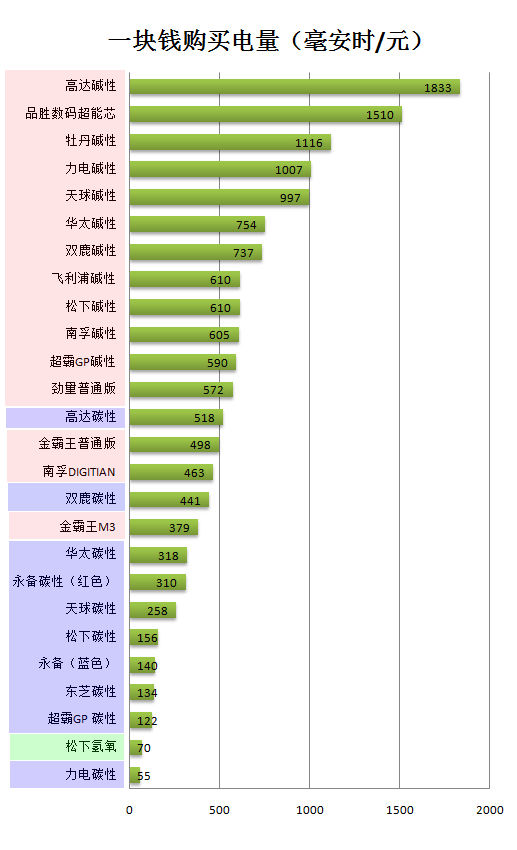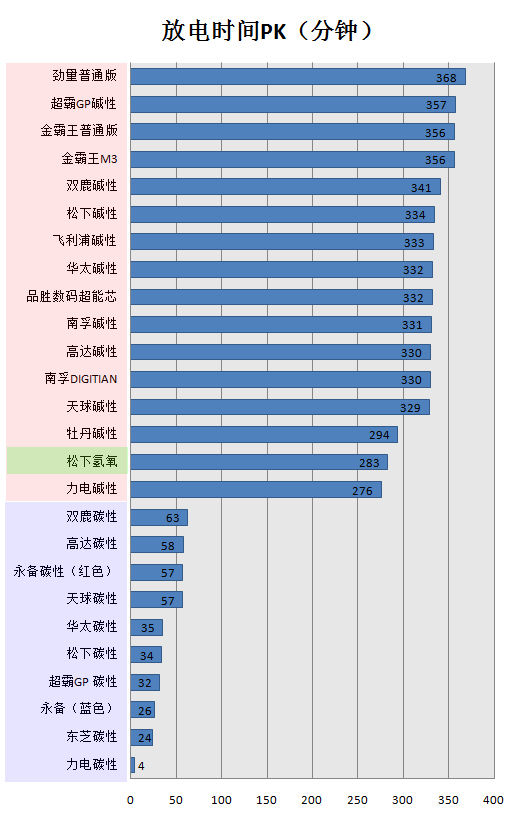 下面公布结果,为了方便大家对比,我们把电池按碱性、碳性、其他,分成了3类,在图表左侧涂了颜色,一看便知。