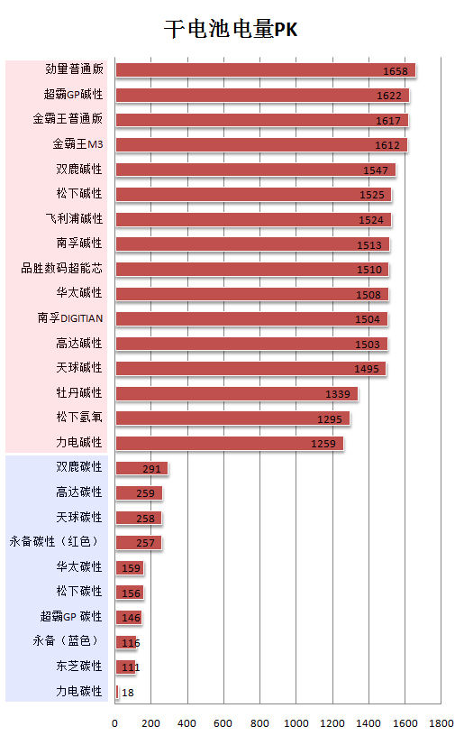 测试的14款碱性电池的平均电量为1516毫安时,10款碳性电池的平均电量为177毫安时。碱性电池的电量大约是碳性的8.56倍。