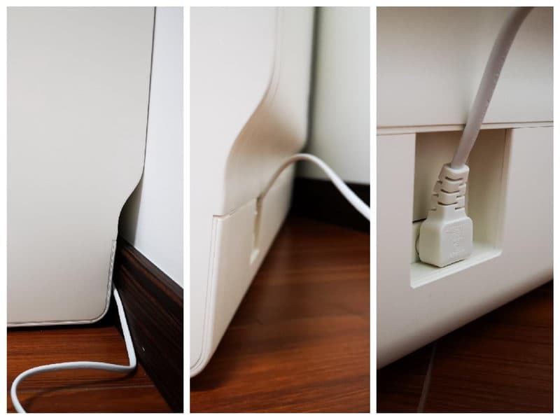▼机身背部的下方自然连接的就是电源线,鞋柜设计的也很周全,考虑到家中的地脚线,为了完全与墙面贴合,不仅将电源线插座进行了内凹的设计,连上电源线后也不会凸出,而且整体底部也进行精巧的设计,完美的避开了地脚线,贴合家庭内实际装修结构。