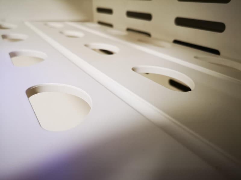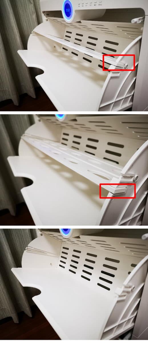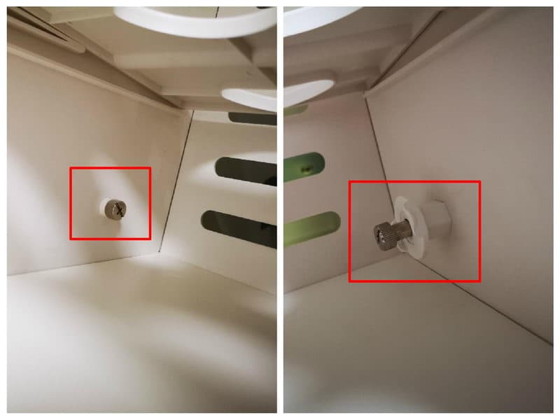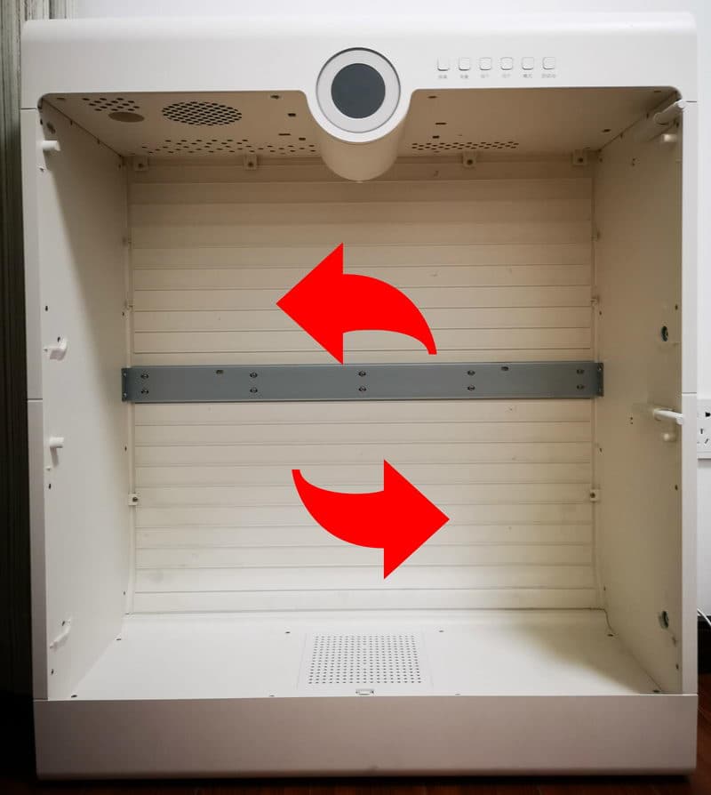 ▼为了更方便了解根元智能鞋柜的内部结构,动手拆除鞋架吧,拆除过程也很方便,每层鞋架两边都有明显的螺丝,并且可以直接徒手旋下,同时右侧还多了一个六方销钉,目的是让开关门可以缓慢进行。装回过程也很简单,只需要将鞋架放入到底就可以自动对齐孔位了。