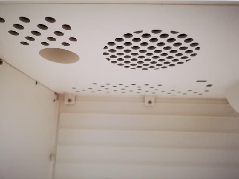 ▼最后,一层一层的拨开底部的活性炭除臭滤网,可以看到在活性炭网下方还有个风扇,配合顶部的一起,不仅可以保持鞋柜内部循环风力,还能利用活性炭吸附更多异味。