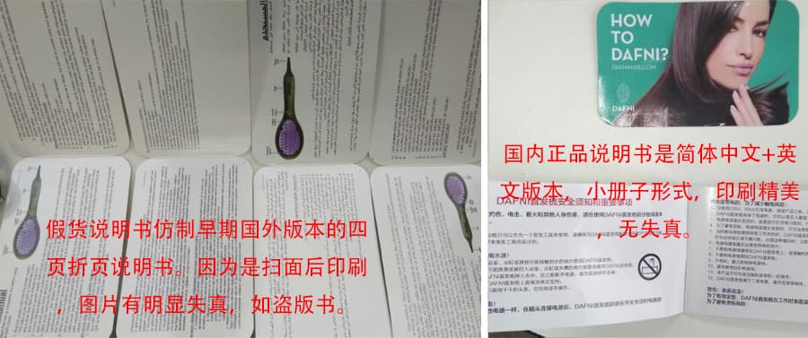 10. 在中国销售的正品说明书是一本小册子,前半部分是简体中文的,后半部分是英文,符合中国的相关法律法规要求。DAFNI先在国外上市,国内的假货都是仿制DAFNI在国外早期上市版本,说明书是四页折页,一直没有更新过。假货说明书和小卡片的印刷能非常明显地看出是扫描后重新翻版的,就像盗版书一样,碰到有图片(渐进色)的地方就会严重失真。