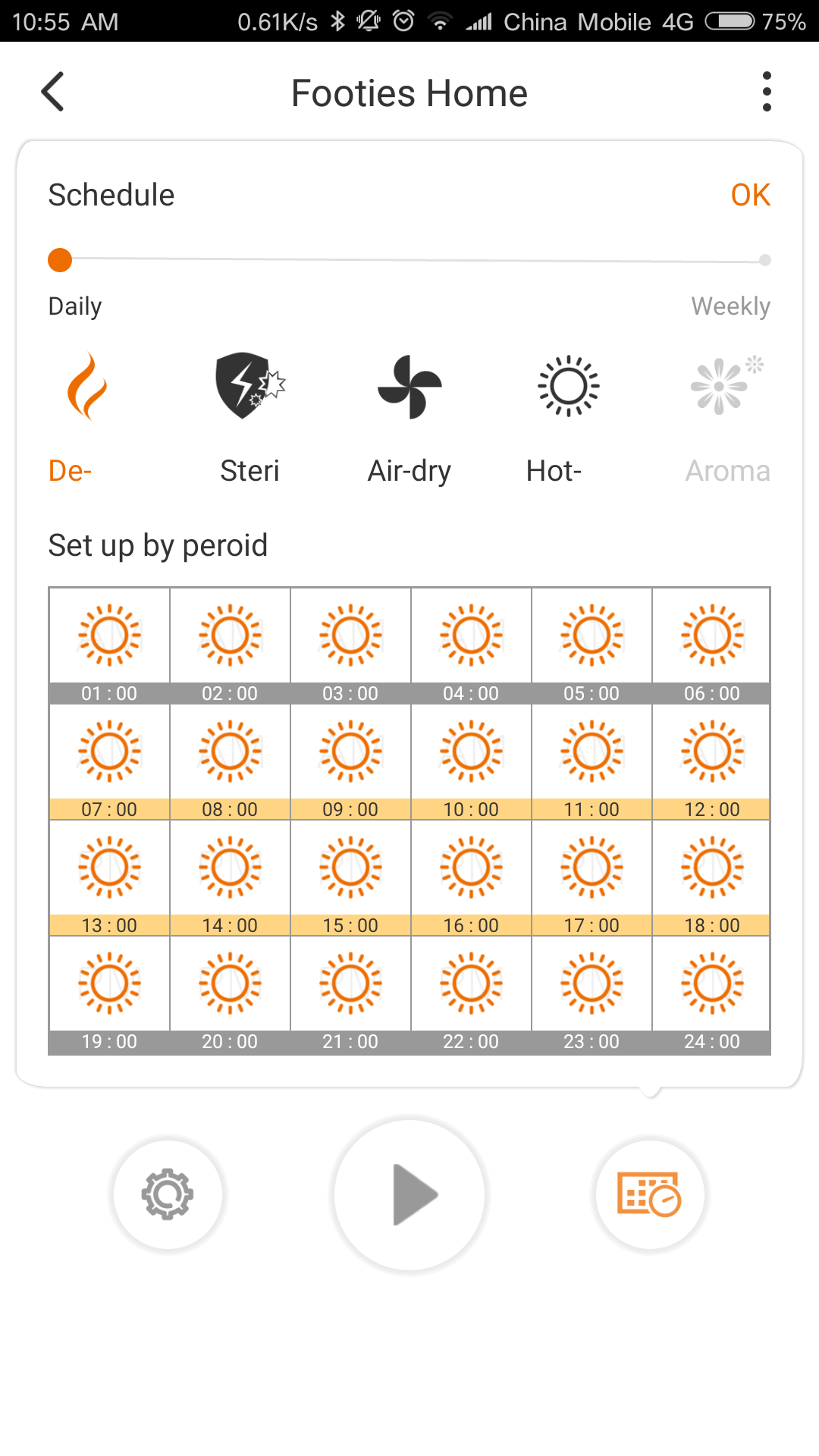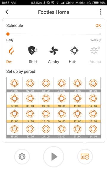 Auto:Footies run schedules from cloud, Footies will adjust according to the local weather. For example, in rain season, footies will run more Hot-Dry tasks to get rid of wet.