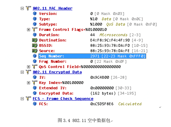 一键配置通过802.11数据包的特定区域传输数据。802.11是IEEE制定的无线局域网协议,以802.2的逻辑链路控制封装来携带IP封包,因此能够以802.2 SNAP格式接收无线网络数据。如果开启wifi芯片的混杂模式监听空间中的无线信号,就会得到如下图所示的数据包: