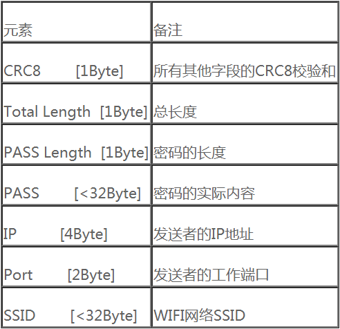 2、快连/一键配置模式:手机APP把相应信息打包到802.11数据包的特定区域,发送到周围环境中;智能设备的WiFi模块处于混杂模式(Promiscuous Model)下,监听网络中的所有报文,直到解析出需要的信息(之前双方约定好数据格式)。
