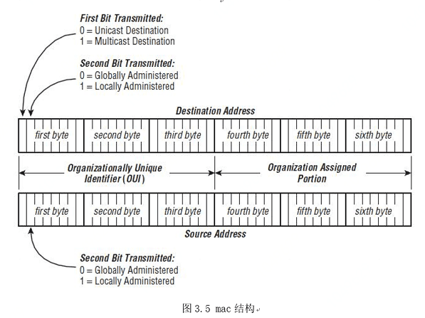 由于802.11处理组播时具有Destination的后三字节与目的组播地址后三字节相同的特性,在实际使用中可以使用组播地址的变化来传递信息。而MAC地址是以太网二层使用的一个48bit(6字节十六进制数)的地址,用来标识设备位置。MAC地址分成两部分,前24位是组织唯一标识符(OUI, Organizationally unique identifier),后24位由厂商自行分配。MAC地址有单播、组播、广播之分。单播地址(unicast address)表示单一设备、节点,多播地址或者组播地址(multicast address、group address)表示一组设备、节点,广播地址(broadcast address)是组播的特例,表示所有地址,用全F表示:FF-FF-FF-FF-FF-FF。当然,三层的IP地址也有单播、组播、广播之分。MAC的结构如下图: