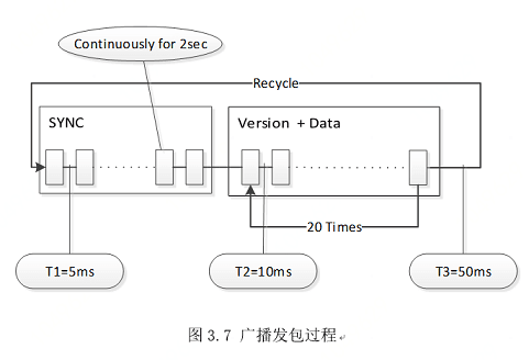 在实际应用中,我们采用UDP广播包作为信息的载体。信息发送方向空间中发送一系列的UDP广播包,其中每一包的长度(即Length字段)都按照一定的规范进行编码,信息接收方利用混杂模式监听空间中的无线信号,并从数据链路层截取802.2 SNAP格式数据包,便可得到已编码的Length字段,随后接收方便可根据协议解析出需要的信息。整个广播发包过程分成同步阶段、Version阶段,Data阶段,其中同步阶段的数据包发包间隔为5ms,Verson和数据的发包间隔为10ms,每轮结束后暂停50ms。同步阶段需要持续发送2秒钟,Version和数据阶段需要连续发送20次为一轮,然后不断重复发送同步阶段和数据阶段,如图所示:
