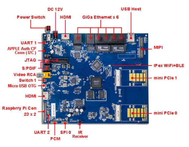 多元化I/O界面:包括HDMI、MIPI、PCIe、USB3、USB2、SDIO、SPI、PWM、ADC、DAC、红外线接收器、PCM以及RGMII+TRGMII