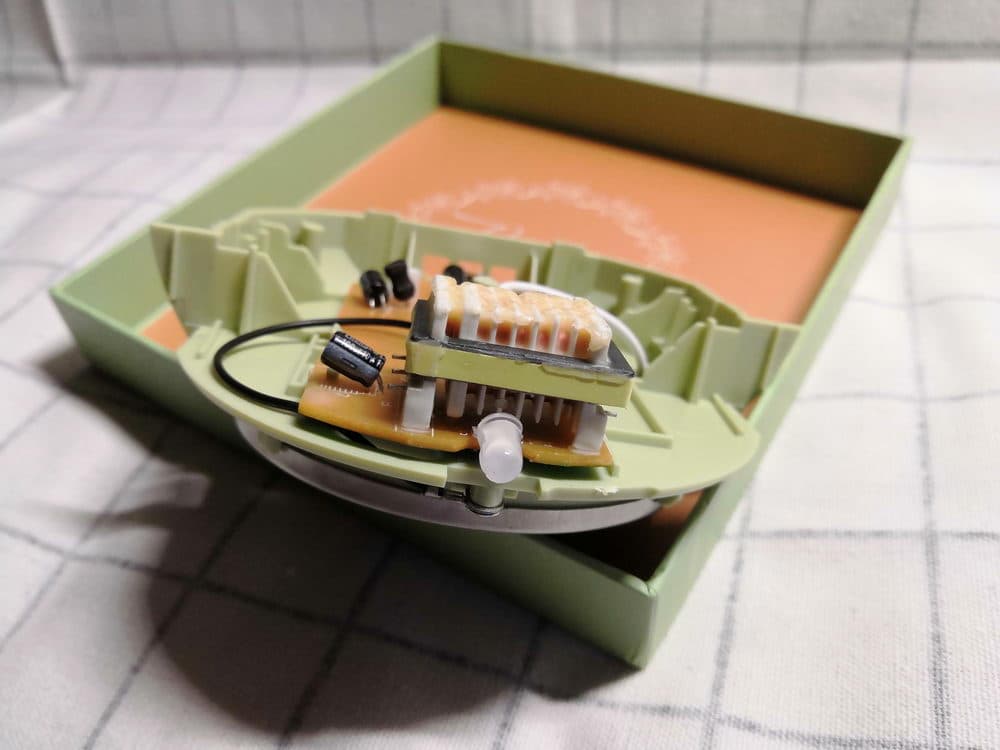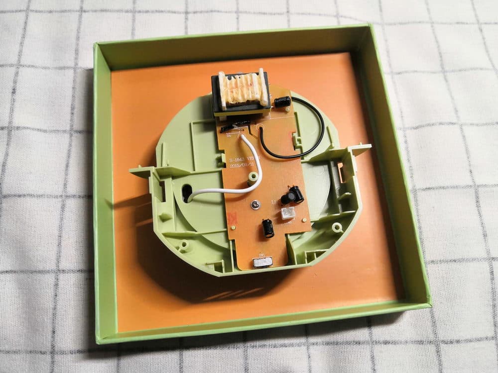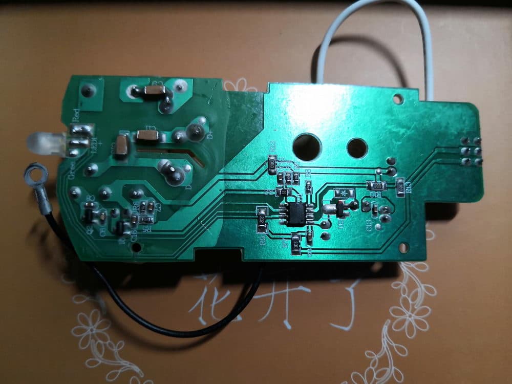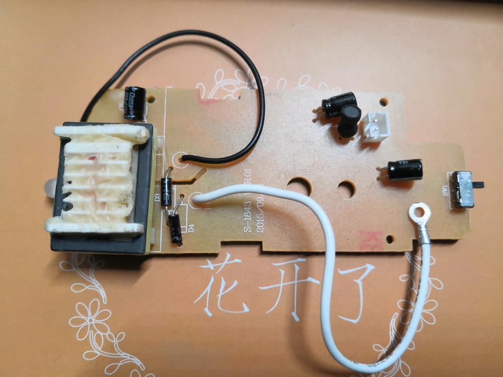 其中笔者比较明确的组件有:右侧的常规档和加强档的切换开关、右上角白色的电源输入接口、左侧的工作指示灯、显眼的变压线圈。至于主板上黑色的组件应该是电容器等装置,结合整个机器的工作原理,笔者推测其中部分应该能起到将直流电转换为交流电的作用。