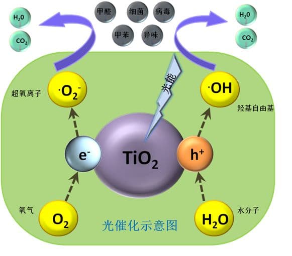 1、光催化技术:日本科学家最先发现光照的TiO2单晶电极能分解水,20世纪90年代光催化技术投入使用。当空气和水经过光触媒材料是技术单元时,通过氧化还原反应产生大量的氢氧根离子OH-、过氧羟自由基HO2、过氧化离子O2-、氢过氧化物H2O2等[2] ,这些离子弥漫在空气中,通过破坏细菌的细胞膜、凝固病毒的蛋白质杀菌消毒[3] ,分解各种有机化合物和部分无机物,祛除有害气体和异味[4] 。已被实验证明的光催化杀菌机理有:细胞渗透作用、辅酶A的破坏、内毒素的降解、蛋白质和脂类的变性分解和细胞矿化等。[5]